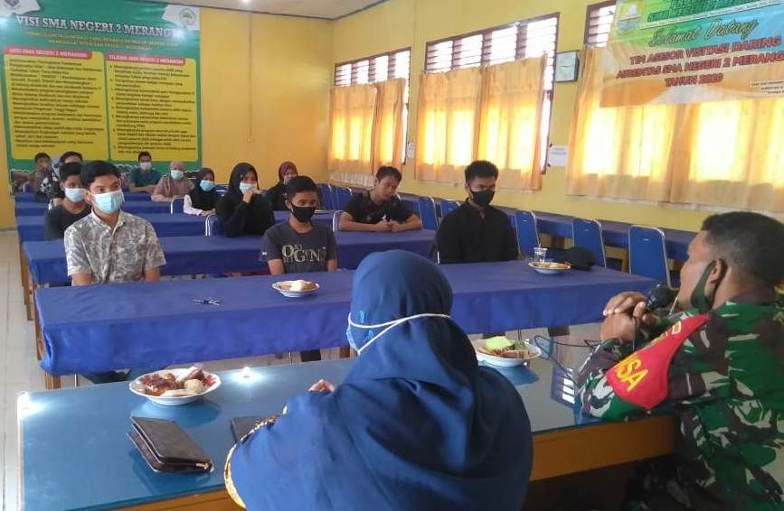 MERANGIN - Dalam rangka membangkitkan minat pelajar menjadi anggota TNI, Babinsa Koramil 420-08/Tabir Kodim 0420/Sarko Pelda Marsudi dan Pelda Sumarno melakukan sosialisasi penerimaan prajurit TNI AD kepada Siswa-Siswi di sekolah SMA N 2 Merangin di Kelurahan Kampung Baru Kecamatan Tabir Kabupaten Merangin, Jum'at(22/1/2021). Pelda Marsudi Babinsa Koramil menyampaikan, bahwa sosialisasi ini merupakan informasi dan pemberitahuan kepada Siswa-Siswi SMA N 2 Merangin dan juga kepada Masyarakat tentang adanya penerimaan Calon Prajurit TNI AD, sekaligus upaya menarik minat Generasi Muda untuk menjadi Prajurit TNI AD. Pelda Marsudi juga menjelaskan, persyaratan untuk menjadi Prajurit dengan mendaftarkan secara on line atau ke Kodim 0420/Sarko maupun ke Ajenrem 042/Garuda Putih Jambi dengan melengkapi persyaratan yang telah ditentukan. "Para pelajar tidak usah sungkan-sungkan untuk bertanya ke Koramil atau ke Kodim apabila ada yang berminat menjadi prajurit. Babinsa siap membantu mengarahkan untuk menjadi Prajurit TNI AD, baik pria ataupun wanita. Siapkan diri sejak dini, baik persiapan fisik, mental dan belajar dengan baik serta rajin berolahraga. Hindari perbuatan-perbuatan yang dapat merugikan diri sendiri maupun orang lain," tandas Pelda Marsudi.