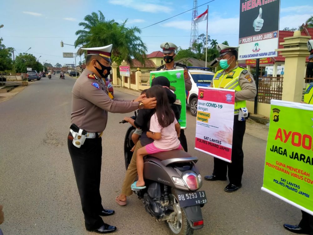 Kasat Lantas AKP M Firdaus melalui Kasubag Humas Polres Muarojambi, AKP Amradi SE menyampaikan, rangkaian kegiatan melaksanakan pembagian masker, pengecekan suhu tubuh mencuci tangan dan air mineral kepada pengendara kendaraan R2 maupun R4.