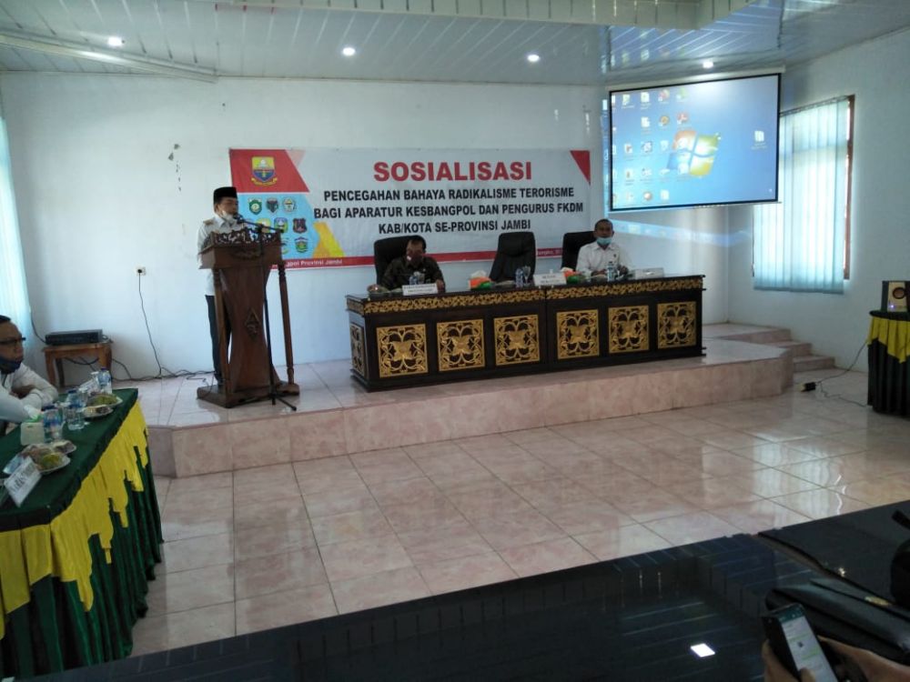 MERANGIN - Badan Kesatuan Bangsa dan Politik (Kesbangpol) Provinsi Jambi menggelar Sosialisasi Pencegahan Bahaya Radikalisme Terorisme bagi Aparatur Kesbangpol dan Pengurus FKDM. Kegiatan yang diikuti Aparatur Kesbangpol dan Forum Kewasapadaan Dini masyarakat (FKDM) dipusatkan di Kabupaten Merangin, diikuti 60 orang peserta dari seluruh Kabupaten dan Kota yang ada di Jambi. Bupati Merangin, Al Haris membuka secara resmi kegiatan tersebut di aula Kantor Kesbangpol, didampingi Kepala Kesbangpol Provinsi Jambi Mukti, SE. ME dan Kepala Badan Intelejen daerah (Binda) diwakili Iptu Rahmad Hardian. Dalam sambutannya Bupati Merangin mengatakan, agar masyarakat di Provinsi Jambi mewasapadai paham-paham yang akan merusak persatuan dan kesatuan bangsa. “Kita tidak mau bangsa kita hancur karena radikalisme dan terorisme. Kita harus waspadai perekonomian kita belum pulih dan angka kemiskinan meningkat. Hal ini bisa menyebabkan ada yang terpengaruh dengan kegiatan tersebut, dan masuk dalam komunitas yang menyimpang,” kata Bupati. Terkait dengan Pemungutan Suara Ulang (PSU) dalam Pilkada di lima kabupaten di Provinsi Jambi, Al Haris mengatakan Merangin aman, meski perlu diwasapadai adanya gerakan dari luar yang bakal membuat keributan. “Kita di Jambi ada PSU wlaupun kita berusaha agar lima daerah yang PSU kondusif akan tetapi nanti boleh saja nanti orang luar yang mencoba untuk mengadu domba kita, dan ini perlu diwaspadai kita semua,“ ungkap Bupati Merangin. Dalam kegaiatan sehari ini, Kesbangpol menghadirkan nara sumber Sigit Eko Yuwono dari Kabid Kesbangpol Provinsi Jambi dan Iptu Rahmad Hardian mewakili Kabinda Provinsi Jambi, membahas Tema Radikalisme dan Terorisme di Provinsi Jambi, dengan moderator Berlina, SH.