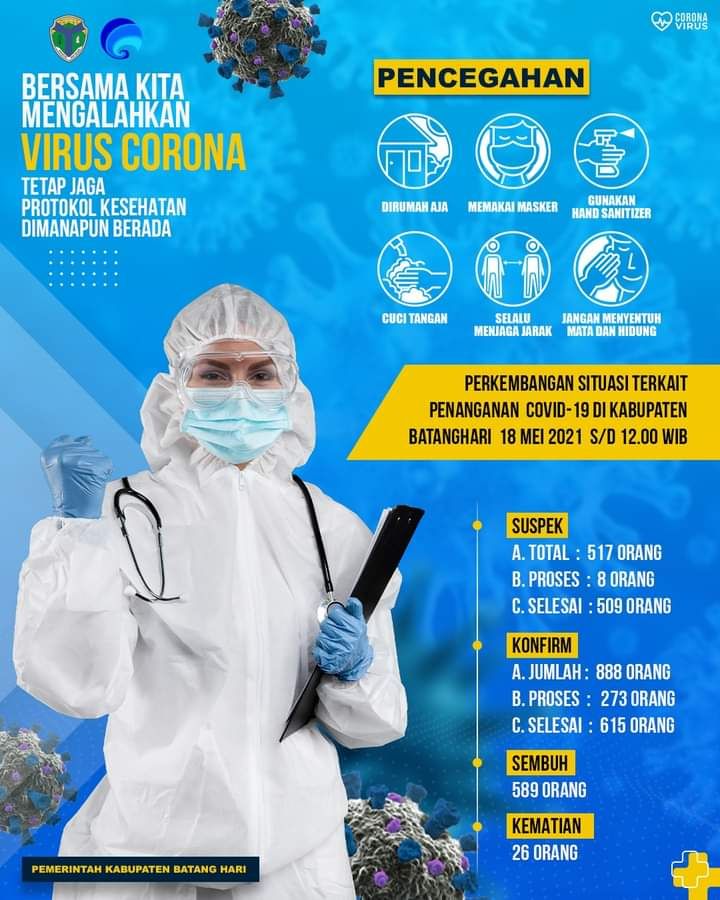 Berikut perkembangan situasi terkait penanganan Covid-19 di Kabupaten Batanghari 18 Mei 2021 s/d 12.00 wib sbb: