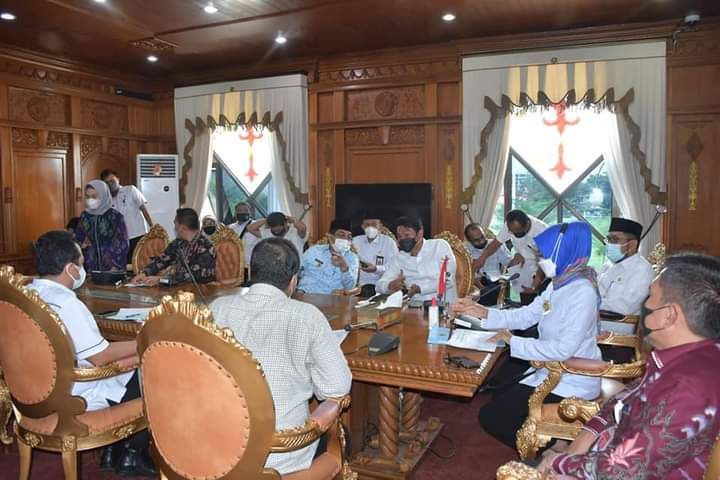 JAMBI - Bertempat di ruang pola kantor Gubernur Jambi, Bupati Tanjung Jabung Timur (Tanjab Timur) menghadiri rapat percepatan penyelesaian penegasan batas daerah antar kabupaten dalam Provinsi Jambi, Rabu (19/5/2021).