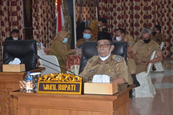MUARABULIAN - Wakil Bupati Batanghari, H. Bakhtiar, SP bersama sejumlah Kepala Organisasi Perangkat Daerah (OPD) dilingkup Pemkab Batanghari mengikuti Zoom Meeting Sosialisasi Arah Kebijakan Dana Alokasi Khusus (DAK), Dana Insentif Daerah (DID), dan APBD tahun Anggaran 2020 untuk Percepatan Penurunan Stunting Bersama Kementerian BKKBN RI, Senin (24/5/2021).