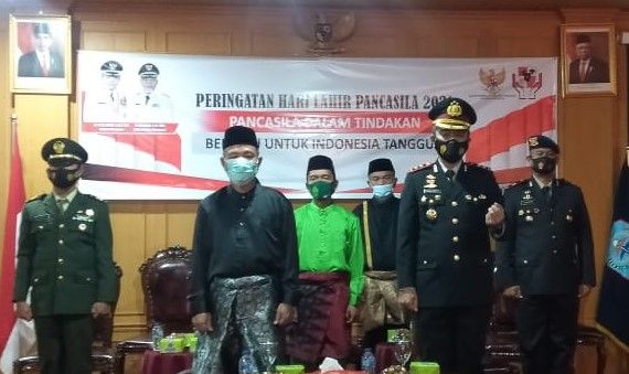 MERANGIN - Secara virtual, Wabup Merangin H Mashuri dan Forkopimda Merangin, mengikuti jalannya upacara peringatan Hari Lahir Pancasila di Istana Kepresidenan, Bogor Jawa Barat, Selasa (01/6). Dari Gedung Bappeda Merangin, wabup bermasker mengenakan baju adat Melayu dan Forkopimda berpakaian dinas lengkap, tampak khidmat mengikuti jalannya upacara yang dipimpin Inspektur upacara Presiden Joko Widodo (Jokowi) tersebut. Jokowi bermasker mengenakan baju adat Tanah Bumbu, Kalimantan Selatan dalam amanatnya, mengajak masyarakat selalu bersatu, saling peduli dan selalu berbagi untuk kemajuan negeri tercinta ini di tengah pandemi Covid-19. Pada upacara yang juga diikuti Ketua MPR RI kBambang Soesatyo, Ketua DPR RI Puan Maharani dan seluruh menteri kabinet kerja itu, Jokowi menegaskan tantangan yang dihadapi tahun ini dan tahun depan tidaklah mudah. “Situasi yang memerlukan daya juang kita sebagai bangsa, yang memerlukan kerja keras agar kita mampu melewati masa sulit itu. Kita tidak sendirian, 215 negara di dunia berada dalam kondisi seperti kita, semua dalam kesulitan,” tutur Jokowi. Namun demikian, Kepala Negara optimistis Indonesia bisa menjadi pemenang, baik dalam pengendalian virus maupun menjadi pemenang dalam pemulihan ekonominya. “Selamat hari lahir Pancasila. Selamat hari lahir Pancasila. Selamat hari lahir Pancasila. Mari kita selalu bersatu, saling peduli dan selalu berbagi untuk kemajuan negeri kita tercinta ini,’’ ujar Presiden. Usai mengikuti Upacara Peringatan Hari Lahir Pancasila Wabup mengatakan, Pancasila sebagai pedoman, sumber inspirasi dan semangat persatuan dan kesatuan Bangsa Indonesia. ‘’Nilai-nilai luhur yang terkandung dalam Pancasila merupakan dasar berdirinya Indonesia dan merajut perdamaian di tengah keberagaman. Pancasila dalam Tindakan, Bersatu untuk Indonesia Tangguh,’’ tegas Wabup. Wabup mengajak seluruh lapisan masyarakat bersama-sama bangkit melawan pandemi Covid-19, sehingga ekonomi kerakyatan cepat pulih seperti semua. Pakai masker, jaga jarak dan rajin mencuci tangan.