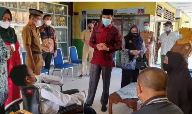 JAMBI - Ketua DPRD Provinsi Jambi, Edi Purwanto menyerahkan bantuan kursi roda kepada Anugrah Alfitrah, siswa kelas 7 SMP Negeri 6 Kota Jambi, Senin (19/4). Dalam kegiatan tersebut Edi didampingi oleh Ketua Fraksi PDI Perjuangan DPRD Provinsi Jambi, Nur Tri Kadarini, Kepala Dinas Sosial Kependudukan dan Pencatatan Sipil (Dinsosdukcapil) Provinsi Jambi, Arief Munandar dan Kepala Sekolah SMP Negeri 6 Kota Jambi, Boy Surau.
