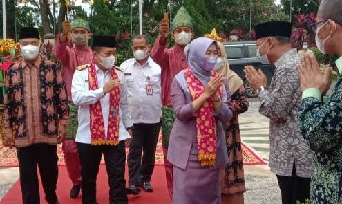 MERANGIN - Pj Bupati Merangin, H. Mashuri dan Pj Ketua TP PKK Merangin, Hj. Nuraida Mashuri, menyambut kunjungan kerja (Kunker) Gubernur Jambi H Al Haris dan Ketua TP PKK Provinsi Jambi Hj Hesty Haris, di rumah dinas Bupati Merangin, Sabtu (10/7/2021). Penyambutan H Al Haris ‘pulang kampung’ itu, dimeriahkan dengan Tarian Sikapur Sirih. ‘’Saya sendiri merasakan seperti mimpi, pak Haris dan ibu menjadi tamu di rumahnya sendiri,’’ujar Pj Bupati. Begitu Tarian Sikapur Sirih berakhir, gubernur dan Istri langsung menyalami para kepala Organisasi Perangkat Daerah (OPD), yang telah berdiri berjejer dari pelataran rumah dinas hingga pintu masuk rumah. Saat menyalami kepala OPD itulah, air mata Hj Hesty Haris mengucur. Begitu juga dengan H Al Haris, saat langkahnya memasuki teras rumah dinas bupati, langsung matanya meneteskan air. Entah apa yang dirasakan oleh mantan bupati Merangin dua periode dan istri tersebut, sehingga menangis pada acara penyambutan yang berlangsung penuh haru, di rumah yang telah sekitar tujuh tahun ditempatinya itu. Usai ngobrol-ngobrol sejenak dengan para kepala OPD, Gubernur kemudian masuk ke kamarnya untuk Sholat Magrib. Sekitar pukul 19.30 WIB, Gubernur dan istri mengikuti acara serah terima memori Jabatan di auditorium rumah dinas bupati.