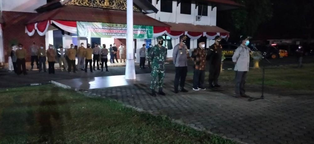 MERANGIN - Bertempat di halaman kantor Bupati Merangin Selasa malam (10/08/21) berlangsung Kegiatan Apel dilanjutkan Patroli Operasi Yustisi dalam rangka Pemberlakuan Pembatasan Kegiatan Masyarakat (PPKM) Berbasis Mikro Level IV. Kegiatan yang di Ikuti oleh TNI - Polri serta Sat Pol PP, Dishub, BPBD dan Dinas Kesehatan Kabupaten Merangin yang di pimpin oleh Plt. Bupati Merangin H. Mashuri dihadiri Forkopimda Kabupaten Merangin, Satgas Covid-19 Kabupaten Merangin. Pada Kesempatan tersebut Penyampaian Plt Bupati Merangin menyebutkan, apel gabungan ini sebagai salah satu upaya untuk memberikan himbauan kepada masyarakat agar tetap menerapkan Protokol kesehatan. "Apel ini bukan apel biasa karena saat ini khususnya di Merangin dalam keadaan tidak baik baik saja sebab tingkat penyebaran Covid-19 di Merangin sudah di level empat," jelasnya. Kita sudah melaksanakan rapat Anev di ruang pola I Kantor Bupati Merangin tadi pagi dalam rangka menindak lanjuti penanganan Covid-19, untuk itu kita akan laksanakan Pengendalian kegiatan masyarakat dengan cara PPKM Mikro seperti kita ketahui PPKM di Jawa dan Bali sudah berlaku pada tanggal 3 Juli kemarin," tambah Mashuri. Ada beberapa daerah yang harus di lakukan PPKM karena Covid sekarang sudah mencapai level empat, konsep PPKM darurat yaitu membatasi seluruh kegiatan masyarakat. "Untuk itu saya mengajak kepada rekan rekan semua untuk menangani Covid ini dengan benar termasuk dalam memberikan pemahaman kepada masyarakat," pungkas Plt Bupati. Sedangkan Dandim 0420/Sarko Letkol Tomy Radya Diansysh Lubis senada dengan Kapolres Merangin menyampaikan semua stakeholder terkait harus bersinergi dengan satukan tekad. "Setelah apel malam dilanjutkan patroli penertiban masyarakat, Tanamkan bahwa ini adalah tugas kita untuk pengabdian kepada masyarakat, jangan merasa kehilangan semangat tugas pokok kita untuk menyelamatkan diri kita, keluarga serta seluruh masyarakat dari penyebaran Covid -19 sehingga kita tidak menjadi korban sia sia," ungkap Dandim. Kegiatan apel dan Patroli gabungan ini sebagai bentuk keseriusan dalam mengantisipasi Covid -19. Pihaknya tidak mau di Merangin kecolongan sehingga tidak membuat kewalahan petugas medis maupun pelayanan kesehatan ketika Covid tidak bisa terkendali. Untuk itu tidak boleh lengah karena tidak bisa diketahui pasti perkembangan Covid di Merangin seperti apa, sehingga TNI Polri serta semua pihak harus bersinergi untuk memberikan pelayanan masyarakat, termasuk tingkat kesadaran diri tiap tiap orang, disiplin Prokes Covid 19 dari semua pihak sangat penting. "Dalam pelaksanaan tugas patroli hendaknya tetap mengedepankan tindakan humanis dan berikan pemahaman kepada masyarakat agar memahami betapa pentingnya saling menjaga demi kesehatan serta keselamatan kita bersama," tutup Dandim. Kegiatan dilanjutkan dengan Patroli gabungan mengedukasi, mengimbauan kepada Pengelola dan Pengunjung sekitaran pasar bawah, pasar baru agar tetap mematuhi protokol kesehatan.