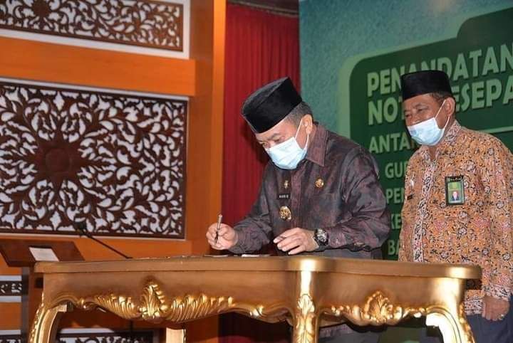 JAMBI - Memberikan keabsahan pencatatan sipil perkawinan dan penerbitan Sertifikat Hak Milik (SHM) tanah masjid, panti asuhan, rumah jompo, menjadi tujuan utama Penandatangan Nota Kesepakatan antara Gubernur Jambi bersama Pengadilan Tinggi Agama Jambi, Kanwil Kemenag Provinsi Jambi, Kanwil Badan Pertanahan Negara Provinsi Jambi, PT.Pos Indonesia Jambi yang berlangsung di Rumah Dinas Gubernur Jambi, Kamis (19/8/21).