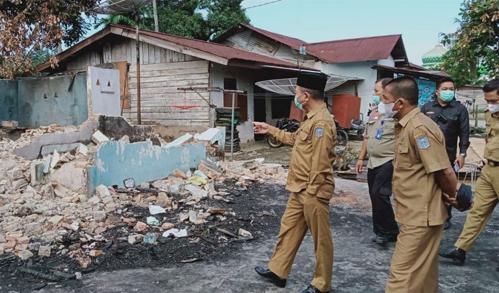 MERANGIN - Bupati Merangin, H. Mashuri menyantuni keluarga korban kebakaran satu unit rumah sebagai tempat Sanggar Seni, milik Ira (31) di kawasan Kebun Sayur, Kelurahan Dusun Bangko Kecamatan Bangko, Senin (30/8/21). Bantuan yang disalurkan H Mashuri itu, berupa bahan kebutuhan pokok sehari-hari, seperti makanan siap saji, rendang daging, beras dan berbagai kebutuhan lainnya termasuk peralatan dapur,terpal dan tikar. ‘’Karena kesibukan tiga hari terakhir ini, saya baru hari ini (30/8/21) bisa menjenguk korban kebakaran tersebut. Bantuan yang sedikit ini merupakan kepedulian Pemkab Merangin kepada masyarakat yang sedang tertimpa musibah,’’ ujar Bupati diantara puing-puingkebakaran. Dikatakan bupati, Pemkab Merangin ikut prihatin atas musibah yang terjadi tiga hari lalu tersebut. Mudah-mudahan keluarga korban tetap sabar dan tawakal menerima cobaan yang sangat ‘pahit’ ini. ‘’Semoga Ibu Ira tetap tawakal dan iklas, menerima semua cobaan ini. Insya Allah apa yang sudah terjadi akan ada hikmahnya bagi Ibu Ira dan keluarga. Kami mendoakan semoga Ibu Ira dan keluarga senantiasa diberi kesehatan. Amin,’’ harap H Mashuri. Sekedar mengingat, rumah Sanggar seni Bangko, terbakar pada Jumat (27/8/21) sekitar pukul 10.00 WIB. Tidak ada korban jiwa pada kebakaran tersebut, diduga api berasal dari kebocoran selang gas elpiji. Kobaran api berhasil dipadamkan oleh tiga unit Mobil Damkar sekitar 30 menit.