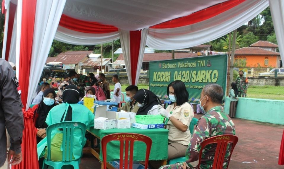 MERANGIN - Kodim 0420/Sarko Korem 042/Gapu Kodam II/Sriwijaya hari ini Selasa (7/9/21) kembali mengelar serbuan vaksinasi TNI untuk masyarakat. Serbuan vaksinasi oleh Kodim 0420/Sarko kali ini bertempat di jantung Kota Bangko. Tepatnya di lapangan tenis Koramil 09/Bangko bersebelahan dengan tugu Pedang sebagai Ikon Kota Bangko dan jalan menuju Kediaman Bupati Merangin, terang Dandim 0420/Sarko Letkol Tomi Radya Diansyah Lubis S.I.P., M. Han saat berada di lokasi vaksinasi tersebut. Tidak hanya di Merangin, hari ini juga terlaksana juga serbuan vaksinasi TNI oleh Kodim 0420/Sarko di Sarolangun. Selain di sini (lapangan tenis) terang Dandim, hari ini kami dari Kodim 0420/Sarko secara tersebar juga melaksanakan vaksinasi di wilayah-wilayah Kecamatan yang berada di Kabupaten Merangin dan Kabupaten Sarolangun. Tim mobille vaksinator TNI yang sudah di bentuk oleh Kodim 0420/Sarko hari juga melaksanakan vaksinasi di Kecamatan Jangkat dan sekitar wilayah tersebut yang di peruntuk bagi masyarakat di peroleh secara gratis dengan ketentuan harus membawa tanda pengenal Kartu Tanda Penduduk dan Kartu Keluarga untuk di data oleh tim tenaga kesehatan. Adapun tujuan dari di selanggarakannya kegiatan ini di jangtung pusat Kota Bangko, agar masyarakat bisa melihat langsung dan sudi untuk datang guna menerima pelayanan suntikan vaksin oleh TNI. Kita akan kejar target untuk masyarakat Kabupaten Merangin dan Kabupaten Sarolangun bisa tervaksin semua, melalui tim mobille vaksinator TNI yang kita bentuk di harapkan mampu menjangkau wilayah-wilayah yang jauh dengan harapan masyarakat terlayani dan bisa vaksin sebagai anti bodi pencegahan virus covid 19, tambah Letkol Tomi. Terlihat H. Mashuri S.P.d., MM Bupati Merangin di dampingi Diretktur RSUD Kolonel Abundjani Bangko dr. Sepheleo yang baru saja di lantik turut menyaksikan pelaksanaan serbuan vaksinasi TNI oleh Kodim 0420/Sarko. Bupati Merangin mengapresiasi terlaksananya pelaksanaan serbuan vaksinasi oleh Kodim 0420/Sarko bagi masyarakat Merangin, “Saya juga menghimbau masyarakat untuk bersedia di vaksin dan ini gratis," terangnya. Lengkapi dosis vaksin satu sampai dosis kedua sehingga kita akan dapat kekebalan tubuh, dan ingat walaupun sudah di vaksin masyarakat juga harus tetap mematuhi dan disiplin menjalan protokol kesehatan. Pelaksanaan vaksinasi di lapangan tenis Koramil 09/Bangko Kodim 0420/Sarko masih berlanjut, dan animo masyarakat masih terlihat antri dengan tetap menjaga jarak, menggunakan masker dan protap untuk mencuci tangan.
