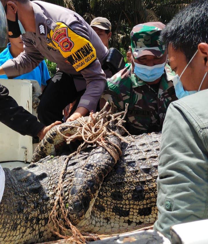 MUAROJAMBI - Masyarakat kecamatan Sungai Gelam kabupaten Muaro Jambi di gegerkan dengan penemuan satu ekor buaya muara berukuran cukup besar yang berkeliaran di Wilayah tersebut. Mendengar kejadian ini pihak kepolisian Polsek Sungai Gelam bersama TNI, masyarakat dan tim BKSDA provinsi Jambi langsung turun ke lokasi, Rabu (15/09/21).