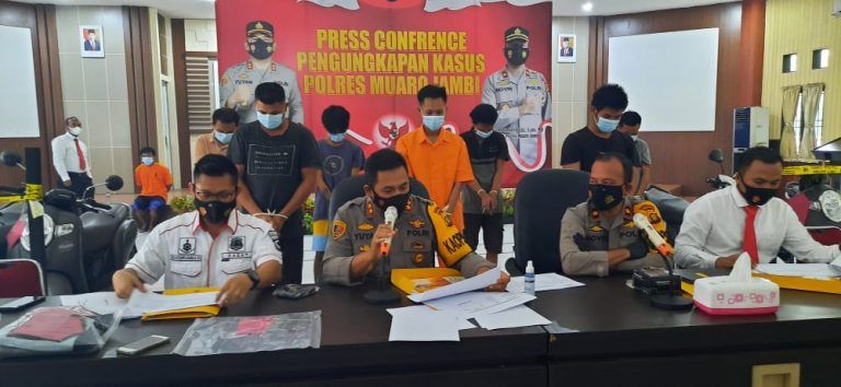 MUAROJAMBI - Kapolres Muaro Jambi, AKBP Yuyan Priatmaja SIK MH didampingi Wakapolres Kompol Nofrizal dan Kasat Reskrim AKP Khoirunnas serta Kasat Narkoba Iptu Feisal melaksanakan Konferensi Pers terkait keberhasilan Satreskrim dan Satresnarkoba dalam ungkap beberapa kasus tindak pidana di wilayah hukum Polres Muarojambi, Senin (4/10/2021).