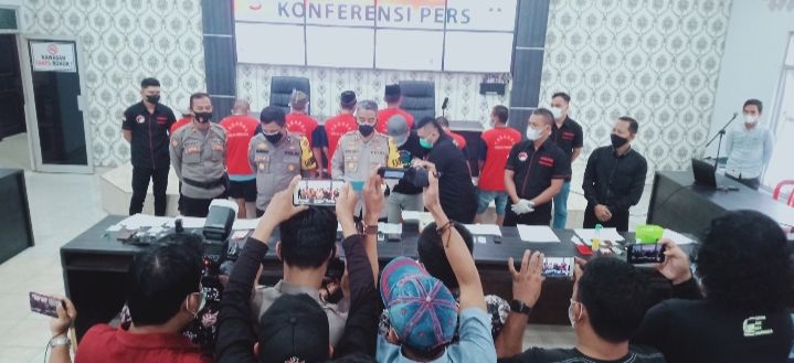 MERANGIN - Polres Merangin kembali gelar Konferensi Pers Terkait penyalahgunaan narkotika di wilhayah hukum Polres Merangin, sejumlah tersangka berhasil di amankan di berbeda. Konferensi pers tersebut dipimpin langsung Kapolres Merangin AKBP Irwan Andy Purnamawan, S.I.K di dampingi Kabag Ops Polres Merangin Kompol Pamenan, SH, Kasat Narkoba Polres Merangin AKP Renovasi Hia,S.I.K,MH dan Kasubag Humas Polres Merangin Iptu Edih, Rabu (10/11/22). Dalam satu bulan terakhir Sat Resnarkoba Polres Merangin berhasil mengamankan tujuh pelaku tindak pindana narkotika dengan barang bukti dan peran berbeda di wilayah hukum Polres Merangin. "Mereka di amankan di wilayah Kecamatan berada di Kabupaten Merangin dan juga hasil pengembangan dari penangkapan pertama, salah satunya terdapat resedivis dengan kasus yang sama," ucap Kapolres. Ketujuh pelaku penyalahgunaan Narkotika tersebut yakni FZ (32) Kuamang Kuning Unit 13 Desa Koto Raja Kecamatan Tabir Ilir Kabupaten Merangin,TW (37) Warga Kuamang kuning unit 4 Desa Daya Murni Kecamatan Pelepat Ilir Kabupaten Bungo, NF (37) Warga Kuamang kuning unit 4 Desa Daya Murni Kecamatan Pelepat Ilir Kabupaten Bungo, HS (37) Warga Desa Panjang Kecamatan Tanah Tumbuh Kabupaten Bungo, PY (45) Warga Desa Seberang Jaya Kecamatan Bhatin II Pelayang Kabupaten Bungo, AN (33) Warga Lubuk Bumbun Kecamatan Margo Tabir Kabupaten Merangin dan AR (39) Warga Desa Simpang Limbur Kecamatan Pamenang Barat Kabupaten Merangin. Para tersangka terdiri dari para pengedar Narkotika jenis sabu-sabu yang selama ini merajalela di Kabupaten Merangin. Dari tangan para pelaku Satres Narkoba Polres Merangin berhasil mengamankan barang bukti berupa narkotika jenis sabu-sabu sebanyak 9,81 Gram. Kapolres Merangin AKBP Irwan Andy Purnamawan,S.I.K Menjelaskan "Saat ini para tersangka di amankan di Mapolres Merangin beserta barang bukti, atas perbuatannya para pelaku di kenakan Pasal 114 ayat (1)(2), pasal 112 ayat (1)(2) undang- undang Republik Indonesia no 35 tahun 2009 tentang Narkotika," tandasnya.