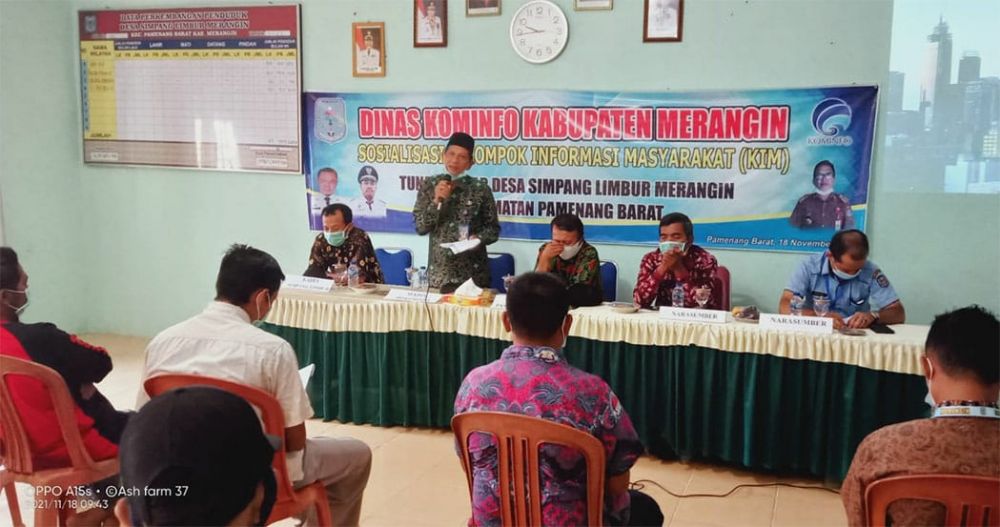 MERANGIN - Dinas Komunikasi dan Informatika (Diskominfo) Merangin melakukan sosialisasi kelompok Informasi Masyarakat (KIM), kepada KIM Tunas Mekar Desa Simpang Limbur Merangin Kecamatan Pamenang Barat, Kamis (18/11/21). Sosialisasi dibuka Bupati Merangin H Mashuri, melalui Kadis Kominfo Merangin M Arief yang diwakilkan ke Sekdin Kominfo H Abdul Azis, di Balai Desa Simpang Limbur Merangin. ‘’KIM adalah kelompok yang sifatnya mandiri dan kreatif. Aktivitasnya mengelola informasi dan pemberdayaan masyarakat dalam rangka mengelola dan mendiseminasikan informasi kepada masayarakat,’’ujar H Abdul Azis. KIM lanjutnya, juga dapat mengedukasi insan informasi, agar memiliki kecerdasan dalam menerima terpaan arus informasi. KIM berkedudukan di tingkat desa maupun kelurahan secara mendiri dan non partisan sebagai wujud partisispasi masyarakat. Pada tingkat dusun, RW atau komunitas lainnya jelas Sekdin, KIM juga dapat dibentuk kelompok-kelompok diseminasi yang kelembagaannya merupakan bagian yang tidak terpisahkan dari kegiaran KIM desa dan kelurahan. Sedangkan dalam penyelenggaraannya, KIM bertujuan sebagai mitra pemerintah dalam penyebarluasan, sosialisasi dan desiminasi informasi pembangunan kepada masyarakat. ‘’KIM mewujudkan masyarakat yang dinamis, perduli dan peka terhadap arus informasi. Selanjutnya masyarakat dapat menjadikan KIM sebagai katalisator dan dinamisator dalam memelihara, meningkatkan semangat kegotong royongan dalam bemasyarakat,’’terang Sekdin. Sosialisasi tersebut menghadirkan dua orang pemateri, Kabid PLKP Diskominfo Merangin Irwandi, S. Ag dan Hamzar, SP dari penyuluh pertanian madya Dinas Tanaman Pangan dan Hortikultura Kabupaten Merangin.