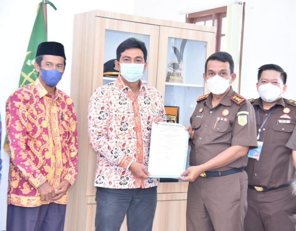 MUARABULIAN - Bertepan dengan Hari Anti Korupsi Sedunia 2021 pada Kamis (9/12/2021) siang, Kepala Kejaksaan Negeri Batang Hari didampingi para Kasi dan Kabubbagbin menerima kunjungan Bupati Batang Hari, Mhd. Fadhil Arief beserta rombongan.