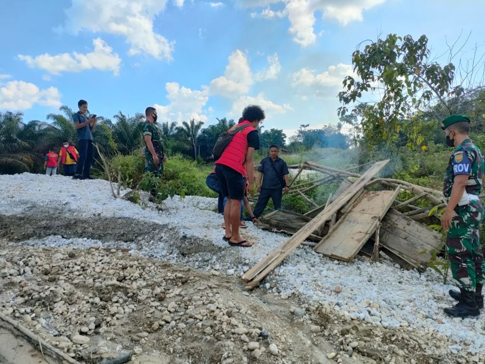 MERANGIN - Kamis (30/12/21), di akhir tahun Tim Gabungan TNI Kodim 0420/Sarko dan Polres Merangin berantas Penambangan Emas Tanpa Izin (PETI) di Jalur Dua Lingkungan Mensawang, Keluarahan Dusun Bangko, Kecamatan Bangko, Kabupaten Merangin. Dalam operasi tersebut, Tim gabungan bersama bakar dua buah Asbuk (peralatan dompeng). Operasi sekitar pukul 15.20 WIB itu dipimpin oleh Danramil 420-09/Bangko Mayor Inf Usman dan Wakapolsekta Bangko Ipda Sakirman. Turut hadir Danunit Inteldim Sarko Letda Inf Hengky, Kanit Tipiter Aiptu Agus, Dansub Inteldim Peltu Taufik dan bersama Anggota. Sebelum operasi, Tim mendapat laporan dari masyarakat. Mereka mengeluhkan aktivitas PETI. Siang harinya Kamis, Tim saling berkoordinasi untuk melakukan razia dan mendapatkan peralatan dompeng (Hasbuk) 2 unit di dua lokasi yang ditinggal pekerja/ pemiliknya dan langsung dibakar di tempat. Dandim 0420/Sarko Letkol Inf Tomi Radya Diansyah Lubis melalui Danramil Bangko Mayor Inf Usman mengatakan, awalnya sekitar Pukul 15.00 WIB personil dari Kodim 0420/Sarko, Polres Merangin bergerak menuju lokasi yang diduga ada aktivitas PETI di Jalur Dua Lingkungan Mensawang Keluarahan Dusun Bangko Kecamatan Bangko. Setibanya di lokasi, tim langsung bergerak menuju lokasi PETI, dan hanya menemukan peralatan dompeng yang ditinggal pekerja atau pemiliknya. Peralatan tersebut langsung dibakar. Sementara pekerja sudah tidak ditempat dan kemungkinan info razia bocor sebelum Tim turun.