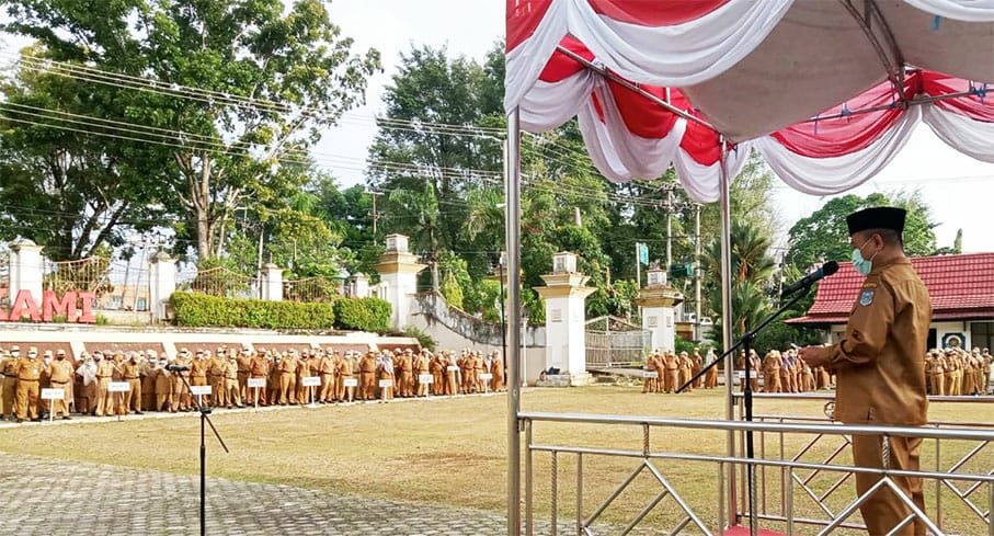 MERANGIN - Seluruh lapisan masyarakat Kabupaten Merangin dan para Aparatur Sipil Negara (ASN) di jajaran Pemkab Merangin, diminta waspada terhadap varian Omicron, yang berkemungkinan puncak terjadi lonjalan pada awal Maret 2022 ini. Hal tersebut ditegaskan Bupati Merangin H Mashuri dihadapan ratusan ASN, pada pengarahan apel kedisiplinan yang berlangsung di halaman depan Kantor Bupati Merangin, Senin (14/2/22). ‘’Menurut ahlinya, Omicron ini tidak seperti varian Delta. Penyebaran Omicron begitu cepat. Bila ada gejala batuk-batuk, pilek dan demam, mohon untuk cepat melakukan isolasi diri,’’ pinta Bupati. Informasikan kondisi kesehatan itu pinta bupati, kepada kepala Organisasi Perangkat Daerah (OPD) yang bersangkutan. ‘’Katakan kepada atasan, saya sedang batuk, pilek dan deman, sehingga isolasi diri di rumah,’’ ujar Bupati. Sehingga bila ASN tersebut terpapar Omicron, tidak menyebar cepat kepada pegawai lainnya dan anggota keluarga. Bupati minta, apapun kegiatan dan aktivitas setiap harinya, harus selalu mematuhi protokol kesehatan pencegahan Covid-19. Pada kesempatan itu, bupati berterimakasih kepada Dinas Tanaman Pangan dan Holtikultura yang telah menjadi petugas apel kedisplinan. Dimana dinas tersebut, merupakan ‘ujung tombak’ keberhasilan program Merangin Mantap 2023. ‘’Ingat waktu kita tinggal 1.5 tahun lagi. Semua kegiatan harus cepat dilakukan, sehingga visi misi Merangin Mantap 2023, unggul di bidang Pertanian dan Pariwisata bisa cepat terwujud,’’ tegas Bupati. Selain itu bupati minta maaf kepada para pegawai, karena sekitar empat bulan kebelakang kurang aktif menjadi pembina apel kedisiplinan, karena kondisi kesehatan yang belum maksinal dan belum bisa berdiri terlalu lama. ‘’Ahlamdulillah berkat doa dan dukungan seluruh masyarakat Merangin dan para ASN, saat ini kondisi kesehatan saya sudah hampir 90 persen sehat sepenuhnya. Mudah-mudahan semua akan pulih seperti semula,’’ tandas Bupati.