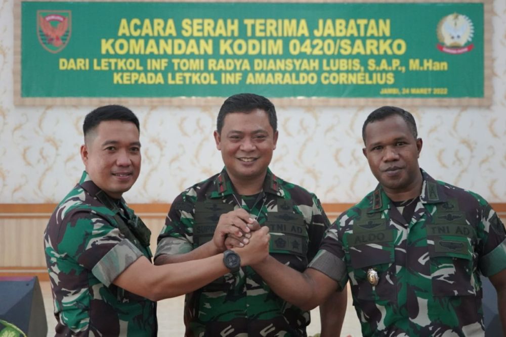 MERANGIN - Kamis, 24 Maret 2022 Letkol Inf Amaraldo Cornelius jabat Dandim 0420/Sarko, hal ini di kuatkan dengan surat perintah Danrem 042/Gapu, serta di laksanakannya serah terima jabatan Dandim 0420/Sarko dari pejabat lama Letkol Inf Tomi Radya Diansyah Lubis S.A.P., M. Han kepada pejabat baru Letkol Inf Letkol Inf Amaraldo Cornelius.