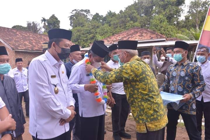 Muarojambi - Wakil Bupati Muaro Jambi, Bambang Bayu Suseno, SP., MM., M. Si mendampingi Wakil Gubernur Jambi, Drs. H. Abdullah Sani., M. Pd. I menghadiri Acara Peletakkan Batu Pertama Pembangunan Masjid Baitussalam Desa Arang-Arang, bertempat di Desa Arang-Arang, Kecamatan Kumpeh Ulu Kabupaten Muaro Jambi
