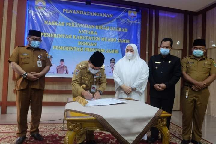 Muarojambi - Senin (21/02/22) Bupati Muaro Jambi Hj. Masnah Busro, SE, M.Tr.IP melakukan penandatanganan Naskah Perjanjian Hibah Daerah (NPHD) antara Pemerintah Kabupaten Muaro Jambi dengan Pemerintah Provinsi Jambi.