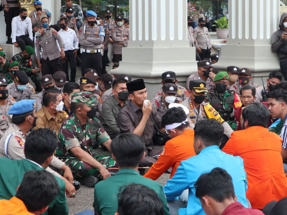 JAMBI – Ketua DPRD Provinsi Jambi, Edi Purwanto, bersama Gubernur Jambi, Al Haris, Kapolda Jambi Irjen Pol Rachmad Wibowo dan Danrem 042/Gapu Brigjen TNI Supriono menerima aksi unjuk rasa (UNRAS) dari Aliansi Mahasiswa dan Rakyat Jambi, Senin (11/4/2022), di halaman Gedung DPRD Provinsi Jambi.