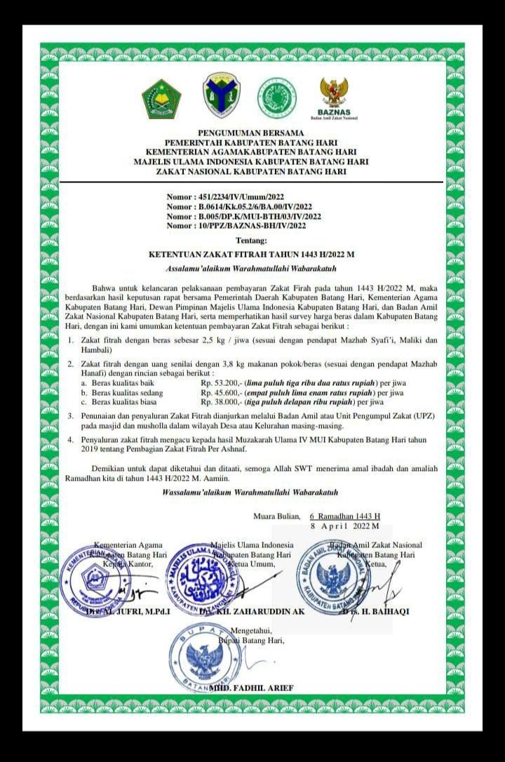 MUARABULIAN - Kementerian Agama Kabupaten Batanghari saat ini telah menetapkan besaran zakat fitrah. Dalam penentuan zakat fitrah tersebut, besaran zakat disesuaikan dengan harga beras di wilayah setempat, mulai dari harga beras berkualitas baik hingga kualitas biasa.