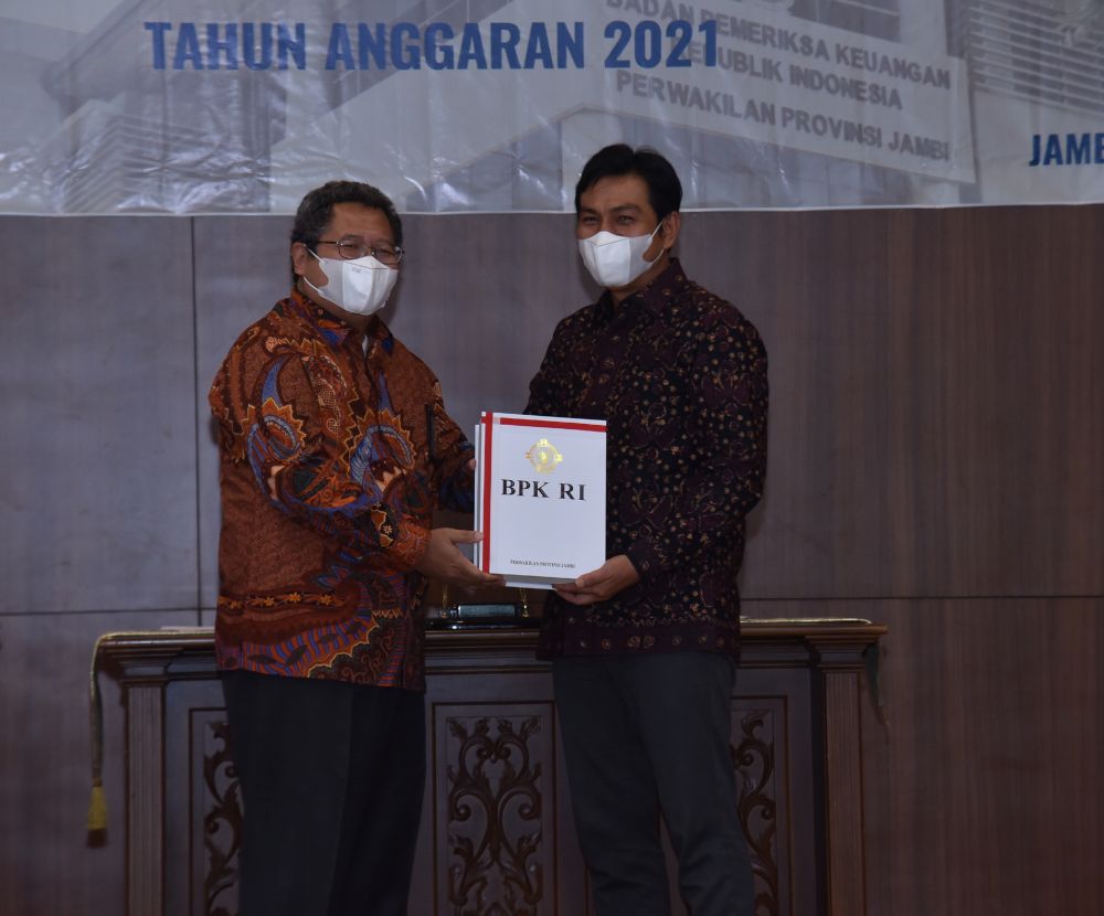JAMBI - Sehubungan dengan telah selesainya pemeriksaan dari Badan Pemeriksa Keuangan (BPK) perwakilan Provinsi Jambi atas Laporan Keuangan Pemerintah Daerah Kabupaten Batanghari tahun 2021, pada Rabu (18/5/2022) di serahkan Laporan Hasil Pemeriksaan (LHP) atas hasil audit terhadap pengelolaan keuangan dengan Predikat Wajar Tanpa Pengecualian ( WTP).