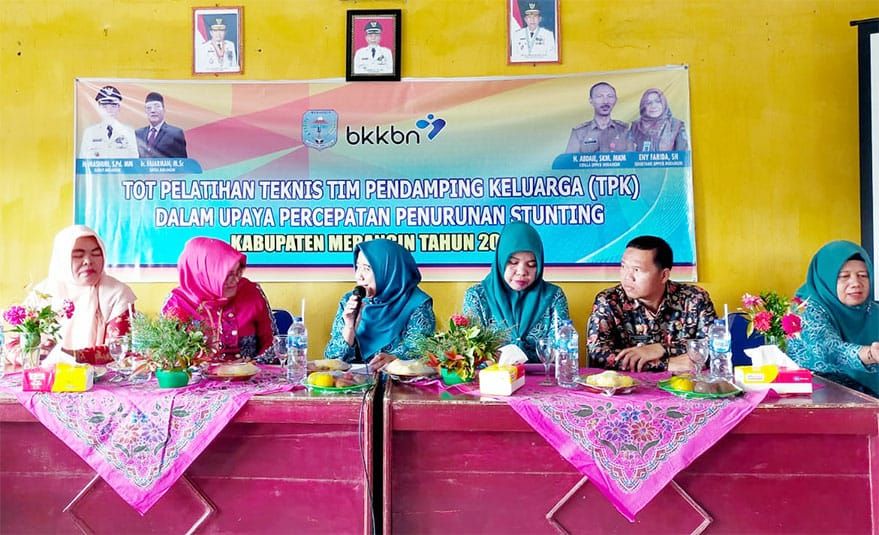 MERANGIN - Tim Pendamping Keluarga (TPK) percepatan penurunan angka stunting di kecamatan dalam Kabupaten Merangin, diharapkan benar-benar mendapatkan informasi dan pembekalan materi secara maksimal, sebelum melakukan pendampingan. Hal tersebut dikatakan Bupati Merangin, H. Mashuri, melalui Ketua TP PKK Kabupaten Merangin Hj Nurhaida Mashuri, saat memantau pelaksanaan pelatihan teknis Tim Pendamping Keluarga (TPK) untuk kecamatan Pamenang, Kamis (16/6/22). Pada pelatihan yang diikuti sebanyak 60 orang kader TPK se-Kecamatan Pamenang di Aula Kantor Camat Pamenang tersebut, Hj Nurhaida Mashuri minta para peserta benar-benar menyimak dan serius mengikuti jalannya pelatihan. ‘’Bagaimana kita bisa melakukan pendampingan keluarga, kalau kita tidak mendapatkan informasi dan tidak semaksimal mungkin menangkap pembekalan materi yang diberikan,’’ terang Hj. Nurhaida Mashuri. Orientasi bagi kader TPK Kecamatan Pamenang itu dilakukan pemateri, Meileni Sari dari Dinas Pengendalian Penduduk dan Keluarga Berencana (DPPKB) Kabupaten Merangin, Ny Hasbiyah dari TP PKK Merangin, Mariyam dari Ikatan Bidan Indonesia (IBI) Merangin. Tampak hadir pada kegiatan yang difasilitator DPPKB Merangin, TP PKK Merangin, Ikatan Bidan Indonesia (IBI) Merangin dan koordinator KB Kecamatan Pamenang itu, Camat Pamenang Habazoh, Sekdin DPPKB Merangin Eny Farida dan koordinator KB Kecamatan Pamenang Sahidman.