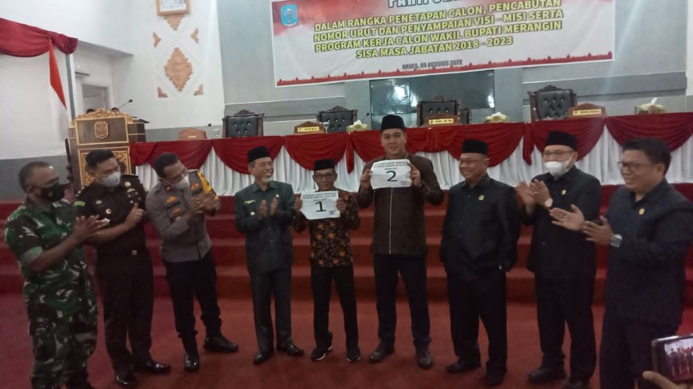 MERANGIN - Bupati Merangin, H. Mashuri sangat merespon kedua putra terbaik Kabupaten Merangin, yang dicalonkan menjadi wakil bupati Merangin sisa masa jabatan 2018-2023. Hal tersebut dikatakan bupati, usai mengikuti jalannya rapat paripurna DPRD Merangin dalam rangka penetapan calon pencabutan nomor urut dan penyampaian visi dan misi serta program kerja calon wakil bupati Merangin, Kamis (04/8/22). ‘’Jadi baik Pak Heri S Mohza maupun Pak Nilwan Yahya, sama-sama berpeluang menjadi wakil bupati Merangin. Intinya mereka harus siap mendampingi dan bekerjasama dengan saya dalam membangun Kabupaten Merangin yang kita cintai ini,’’ ujar Bupati. Pada sidang tersebut, setelah dilakukan pencabutan nomor urut yang dipimpin Ketua Panlih, As'ari El Wakas, ditetapkan Heri S Mohza sebagai calon wakil bupati nomor urut I (satu) dan Nilwan Yahya sebagai calon wakil bupati nomor urut II (dua). Sidang penetapan nomor urut calon wakil bupati Merangin itu, dipimpin Wakil Ketua DPRD Merangin H Zaidan, diikuti sebanyak 31 orang anggota DPRD Merangin yang hadir, dari total anggota dewan Merangin sebanyak 35 orang. Semua angota dewan menyetujui penetapan nomor urut calon wakil bupati Merangin tersebut. Selanjutnya pada paripurna berikutnya akan dilakukan pemilihan pemilihan wakil bupati Merangin oleh para anggota dewan.