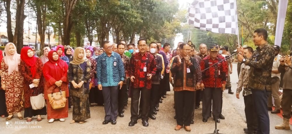 MERANGIN - Geger, ribuan Aparatur Sipil Negara (ASN) dari berbagai instansi di jajaran Pemkab Merangin berpakaian batik khas lokal dan batik Jambi, berbaris melakukan longmars dari depan kantor bupati sampai ke Kantor Kejari Merangin, Kamis (29/9/22). Para ASN dari kelas bawah sampai setingkat kepala dinas itu, ramai-ramai mengikui Parade Batik Jambi, bersama Wabup Merangin Nilwan Yahya dan Wakil Ketua TP PKK Merangin Ny Juliarti Nilwan. Parade batik yang digelar dalam rangka peringatan Hari Batik Nasional 2022 tersebut, berlangsung meriah dan spektakuler, disaksikan ribuan pasang mata dari balik kaca jendela mobil yang berlalulalang di Jalan Lintas Sumatera sebelah lokasi acara. ‘’Alhamdulillah tadi sudah saya lepas Parade Batik Jambi dan saya juga langsung masuk ke barisan, untuk ikut memeriahkan parede Hari Batik Nasional tahun ini. Peserta ada yang memakain Batik Merangin dan ada juga mengenakan Batik Jambi,’’ujar Wabup. Nilwan Yahya sangat bersyukur, karena acara yang didukung Diskominfo Merangin, yang bisa disaksikan secara live lewat zoom meeting seluruh kabupaten/kota se-Provinsi Jambi tersebut, barlangsung sukses tanpa mengganggu jalannya arus lalulintas. Usai Parade Batik yang dilakukan serempak di seluruh kabupaten/kota di Jambi itu, digelar Fashion Street yang diikuti ratusan pasang model batik utusan dari setiap Organisasi Perangkat Daerah (OPD), instansi vertical dan utusan dari sekolah-sekolah. Ratusan pasang model batik itu tampil penuh percaya diri, berlenggak-lenggok dan sekali-kali memutarkan tubuh diatas catwalk merah sepanjang 20 meter. Gerakan para model itu selaras dengan musik yang dialunkan. Menariknya aksi-aksi peserta Fashion Street tersebut, mendapat sambutan luar biasa dari penonton, terlebih bila ada model yang berjalan sambil menggandeng pasangannya.