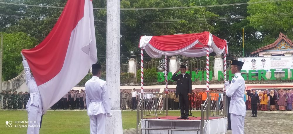 MERANGIN-Mari bersatu membangun bangsa. Peringatan Hari Sumpah Pemuda menghadirkan sejarah masa lalu untuk direnungkan, dipelajari, sehingga ditemukan kristalisasi pembelajaran kebaikan, diteladan dan jadi inspirasi menuju visi bangsa besar. Hal tersebut ditegaskan Bupati Merangin H Mashuri saat menjadi pembina upacara peringatan Hari Sumpah Pemuda ke-94, membacakan sambuan Menteri Pemuda dan Olahraga H Zainudin Amali, di halaman depan kantor bupati Merangin, Jumat (28/10/22). Sumpah Pemuda 28 Oktober 1928 lanjut bupati, memberikan pelajaran kepada semua bagaimana menyikapi perbedaan sikap primordial, suku, agama, ras dan kultur, serta berbagai kepentingan menjadi kekuatan, bukan sebagai faktor yang melemahkan. Sejarah menjelaskan, pilihan pemuda waktu itu telah menjadi tonggak kuat menuju kemerdekaan. Peran pemuda memplopori membangun dengan Sumpah Pemuda 1928 yang diikuti rangkaian pergerakan mengantarkan proklamasi kemerdekaan Indonesia. Pada upacara yang diikuti berbagai elemen kepemudaan, Korpri, TNI, Polri, Korpri, Pelajar, Mahasiswa, Menwa dan berbagai organisasi kepemudaan tersebut, bupati menegaskan Sumpah Pemuda sudah tertaman dalam jiwa pemuda Indonesia. Tema ‘Bersatu Bangun Bangsa’ memberikan pesan mendalam bahwa bersatu padu adalah harga mati yang harus dikuatkan untuk membangun ketangguhan. Melalui ketangguhan dan persatuan menjadi kekuatan dalam melakukan pembangunan. Tampak hadir pada upacara itu, Wakil Bupati Merangin Nilwan Yahya, Sekda Fajarman, Ketua DPRD Merangin Herman Effendi dan unsur Forkopimda lainnya, para Asisten Setda Merangin, para staf ahli bupati serta para pejabat di jajaran Pemkab Merangin.