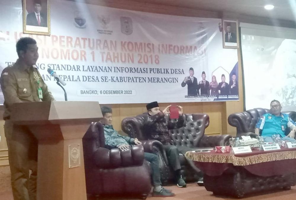 MERANGIN–Wakil Bupati Merangin, Nilwan Yahya, membuka acara sosialisasi Peraturan Komisi Informasi No 1 tahun 2018, tentang standar layanan informasi publik desa dengan kepala desa se-Kabupaten Merangin, Selasa (6/12/22). Pada acara yang berlangsung di Aula Depati Payung Bapeda Merangin tersebut, tampak hadir Ketua Komisi Informasi Provinsi Jambi Indra Lesmana dan anggotanya Siti Masnidar, Kadis Kominfo Merangin M Arief serta sejumlah pejabat Pemkab Merangin. Sosialisasi itu menghadirkan narasumber Ketua DPRD Provinsi Jambi Edi Purwanto, dengan materi ‘Peran DPRD Provinsi Jambi dalam mendorong keterbukaan informasi’. Acara itu diikuti para camat dan kepala desa se-Kabupaten Merangin. Dikatakan wabup, sosialisasi standar layanan informasi publik desa dengan kepala desa itu, sangat penting dilakukan. Diakui wabup, selama ini para kepala desa dan masyarakat desa belum tahu betul tentang hal tersebut. ‘’Kami mengharapkan sosialisasi yang didukung sepenuhnya oleh Dinas Kominfo Kabupaten Merangin ini, bisa berlanjut ke desa-desa lainnya yang hari ini tidak sebagai peserta,’’ujar Wabup. Dijelaskan wabup, di Kabupaten Merangin terdapat 205 desa dan 10 kelurahan. Untuk wilayah Kabupaten Merangin paling luas di Provinsi Jambi dengan jumlah penduduk terbanyak ketiga di Provinsi Jambi. Ketua Komisi Informasi Provinsi Jambi Indra Lesmana mengatakan, tujuan dilakukannya sosialisasi itu untuk memberikan pemahaman kepada Pemerintah Desa arti pentingnya keterbukaan informasi publik. ‘’Apa yang menjadi kewajiban dan tugas PPID di setiap desa itu, sehingga bisa menyampaikan informasi-informasi itu kepada masyarakat. Jadi penyampaian informasi publik itu ada standarnya,’’terang Indra Lesmana. Ketua DPRD Provinsi Jambi Edi Purwanto menegaskan, kepala desa harus bisa memberi pelayanan prima, pelayanan maksimal kepada warganya. Ada kades-kades Jambi yang luar biasa, bisa menjadi trend center, itu ada dari Merangin. ‘’Kades-kades boleh ke Gedung DPRD Provinsi Jambi, biasanya kalau kades datang ke kami pulangnya selalu mendapat oleh-oleh. Minimal dapat anggaran Rp 500 juta, biasanya begitu,’’ujar Edi disambut tawa kades yang hadir. Pada kesempatan itu, Ketua DPRD Provinsi Jambi mengajak semua peserta sosialisasi untuk bersama-sama membuka ruang keterbukaan informasi publik. Data-data dan dolumen-dokumen yang dimiliki minta untuk dibuka. ‘’Misalnya ada pekerjaan proyek, diumumkan siapa PT-nya, berapa anggarannya, semua harus jelas supaya kita sama-sama mengawasi pengerjaan proyek itu,’’tegas Edi kembali disambut tepuk tangan oleh para peserta sosialisasi.