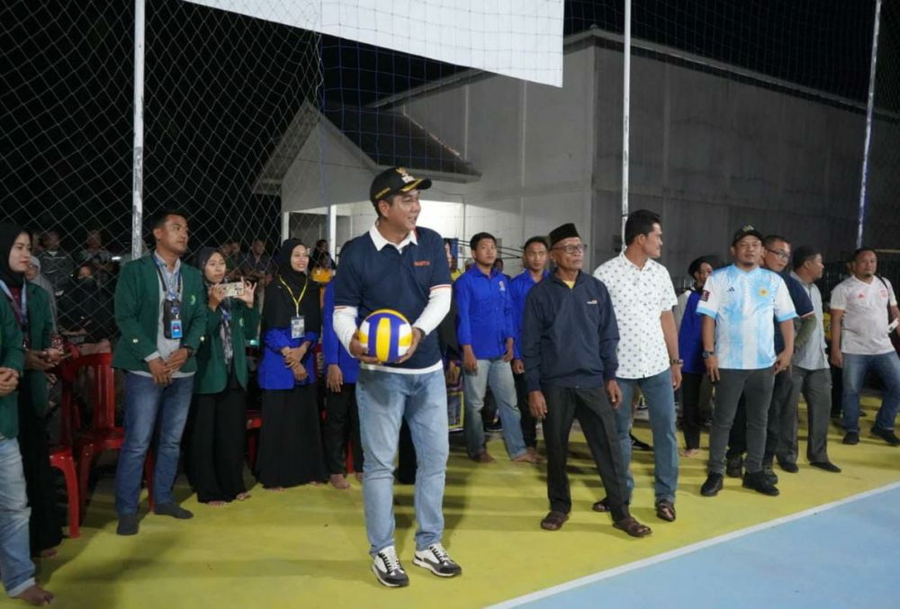 MERANGIN - Wabup Merangin, Nilwan Yahya melakukan pemukulan bola pertama, tanda dimulainya Turnamen Volly Ball Sungai Udang Cup I, di Lapangan Gedung Olahraga Seni (GOS) Desa Sungai Udang Kecamatan Pamenang, Rabu malam (04/1/23).