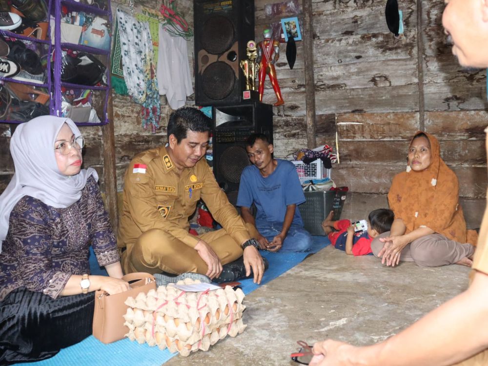 MERANGIN - Setelah melakukan monitoring dan evaluasi Kesehatan Masyarakat dan Kemiskinan (KMK) di Aula Kantor Camat Bangko, wabup Merangin Nilwan Yahya langsung turun ke lapangan, Senin (16/1/23). Wabup bersama Kadis Pengendalian Penduduk dan Keluarga Berencana (PPKB) H Abdaie, Kadis PMD Andre, Sekdin Perizinan Herman dan Kapus Bangko Amroni, menyantuni sejumlah warga miskin dan anak stunting di kelurahan Pasar Bangko. ‘’Mereka sangat membutuhkan protein yang cukup, makanya kita beri telur dan susu. Mudah-mudahan bantuan ini bisa sedikit mambantu kebutuhan protein warga tersebut,’’ujar Wabup didampingi Wakil Ketua TP PKK Merangin Ny Juniarti Nilwan. Sejumlah warga miskin yang disantuni wabup bersama rombongan itu diantaranya, Ibu Nipas. Sedangkan anak yang disantuni wabup diantaranya Dani (3) dan Bilar (3). Mereka semuanya warga Kelurahan Pasar Atas Bangko. Pada kesempatan itu wabup minta kepada warga yang disantuni, untuk segera ke Puskesmas Bangko, apabila mengalami keluhan kesehatan. Jadi jangan sakitnya kian parah baru dibawa ke Puskesmas. Sedangkan untuk Badan Penyelenggara Jaminan Sosial (BPJS) Kesehatan warga miskin yang santuni wabup tersebut, sudah ditanggung secara mandiri oleh Puskesmas Bangko. Wabup minta kepada kepala Organisasi Perangkat Daerah (OPD) yang ikut bersamanya, untuk terus memperhatikan warga miskin dan anak-anak stunting, sehingga terbantu, apalagi bersedia menjadi bapak asuh dari anak-anak stunting tersebut.