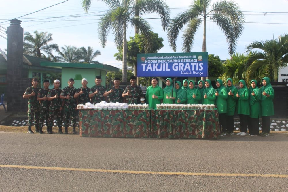 MERANGIN - Senin 10 April 2023, saling memberi dan saling berbagi kepada sesama merupakan keindahan tersendiri bagi kita, begitu juga saling berbagi selama bulan Ramadhan dengan saling berbagi antara sesama bisa meringankan beban dan menjadi ladang amal jahiriyah. Bertempat di Makodim 0420/Sarko Merangin Jambi, sore ini pejabat Kodim 0420/Sarko bersama staf turun ke jalan guna memberikan takjil berbuka puasa untuk masyarakat. Pemberian takjil sore ini bertempat di pinggir jalan depan Kodim 0420/Sarko dengan pertimbangan untuk memudahkan dalam pendistribusian memberikan takjil tersebut sehingga tepat sasaran, di karenakan sore hari banyak warga yang melintas di jalan tersebut. "Total ada 600 bungkus takjil yang kita siapkan sore ini untuk di berikan kepada masyarakat secara gratis," jelas Kasdim 0420/Sarko Mayor Inf Usman S.Ag. M.Pdi yang terlibat langsung dalam pendistribusian pembagian takjil sore ini. Ini merupakan bentuk kepedulian TNI AD kepada masyarakat terlebih-lebih di bulan puasa Ramadhan. Di harapkan takjil yang kita berikan ini bisa memenuhi dan mencukupi kebutuhan masyarakat yang mendapatkan untuk santapan berbuka puasa sore ini. Adapun personil yang terlibat dalam pembagian takjil sore ini antara lain staf bersama Ibu-ibu Persit KCK Cabang XXVII Dim 0420/Sarko di pimpin langsung oleh Pejabat Kodim 0420/Sarko Letkol Inf Amaraldo Cornelius, di luar dugaan dalam waktu singkat ratusan bungkus takjil ludes di serbu warga, pembagian takjil ini terpantau tertib berjalan dengan baik dan sukses.