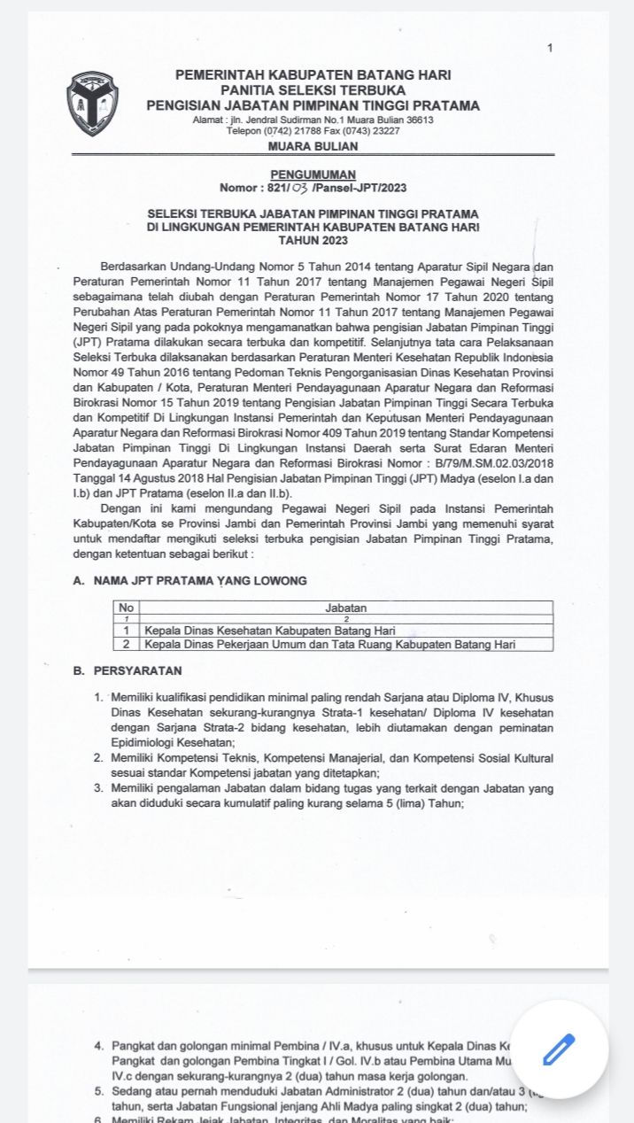 MUARABULIAN – Pemerintah Kabupaten (Pemkab) Batanghari melalui Panitia Seleksi terbuka Jabatan Pimpinan Tinggi Pratama (JPTP) resmi mengumumkan seleksi terbuka JPT Pratama dua Organisasi Perangkat Daerah (OPD) dilingkungan Pemkab Batanghari tahun 2023.