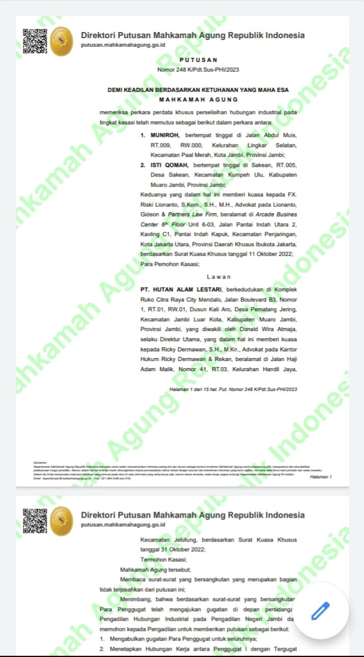 Untuk diketahui, berdasarkan putusan kasasi Nomor 248K/Pdt.Sus-PHI/2023, Mahkamah Agung mengadili sendiri perkara ini dan membatalkan putusan Pengadilan Hubungan Industial (PHI) Jambi Nomor 15 /Pdt.Sus-PHI/2022/PN.Jmb. dalam amar putusannya Mahkamah Agung mengabulkan permohonan kasasi penggugat untuk sebagian.