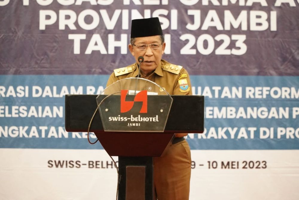 JAMBI  - Wakil Gubernur Jambi Drs.H. Abdullah Sani, M.Pd.I mengharapkan Rakor Gugus Tugas Reforma Agraria dijadikan momentum untuk menyelesaikan sengketa dan konflik pertanahan di Provinsi Jambi. Pernyataan ini disampaikan Wagub saat membuka Rapat Koordinasi Gugus Tugas Reforma Agraria Provinsi Jambi tahun 2023 yang diselenggarakan di Swiss Bel hotel pada selasa (09/05/2023). Tampak hadir pada acara tersebut  Kepala Dinas Kehutanan Akhmad Bestari, S.H.M.H., Staf Ahli Gubernur Bidang Pemerintahan, Hukum dan Politik Dr. Donny Iskandar, S.SOS.  M.T  serta tamu undangan lainnya.