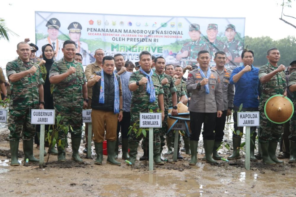 TANJAB TIMUR - Gubernur Jambi Dr. H. Al Haris, S.Sos., MH mendampingi Pangdam Kodam II Sriwijaya MAYJEN TNI HILMAN HADI, S.I.P., M.B.A., M.Han., dalam kunjungan kerja di Provinsi Jambi dalam rangka menghadiri acara Penanaman mangrove nasional secara serentak oleh jajaran TNI di seluruh Indonesia tahun 2023 dengan mengambil tema “Mangrove For Better Life”. Penanaman secara serentak di 37 provinsi di 370 lokasi penanaman. Khusus wilayah Provinsi Jambi dilaksanakan di Desa Lambur Luar Kecamatan Muara Sabak Timur Kabupaten Tanjung Jabung Timur. Senin (15/05/2023).