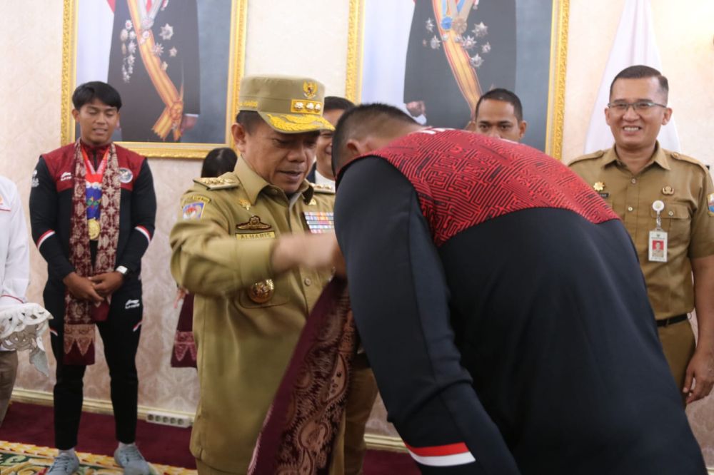 JAMBI - Gubernur Jambi Dr. H. Al Haris, S.Sos, MH menyampaikan rasa syukurnya karena atlet-atlet dari Provinsi Jambi yang diutus ke SEA Games 2023 Kamboja, semuanya sukses meraih medali. Hal tersebut disampaikan Gubernur saat Penyambutan dan Pemberian Tali Asih Atlet SEA Games 2023, bertempat di Peranginan Depan Rumah Dinas Gubernur, Selasa (23/05/2023).