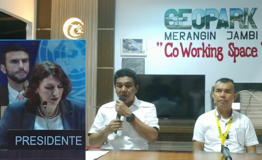 MERANGIN - Geopark Merangin resmi ditetapkan sebagai Unesco Global Geopark (UGG), dalam sidang Dewan Eksekutif UNESCO di Paris, yang diselenggarakan secara virtual, Rabu (24/5/23). Pada sidang yang diikuti Wabup Merangin Nilwan Yahya bersama General Manager Geopark Merangin Dr Agus Zainuddin secara virtual dari Gedung Bappeda itu, Geopark Merangin direkomendasikan UNESCO Global Geopark Council (UGGC) untuk diinskripsi sebagai UNESCO Global Geopark. Geopark Merangin menjadi satu dari 18 UNESCO Global Geopark baru yang ditetapkan dalam sidang tersebut. ‘’Alhamdulillah setelah melalui perjuangan yang cukup panjang dan kerja keras semua pihak, Geopark Merangin lolos jadi UGG,’’ujar Wabup. Dijelaskan wabup, Geopark Merangin yang terletak di sepanjang aliran Sungai Batang Merangin Provinsi Jambi, menjadi salah satu prioritas dalam pembahasan dan berhasil mendapatkan rekomendasi positif untuk dimasukan ke dalam daftar UGG. UNESCO lanjut wabup, mengakui keberagaman geologis Geopark Merangin. Keberagaman tersebut termasuk lanskap, fosil, bebatuan, mineral, proses geologis dan tektonik, serta evolusi bumi di Kabupaten Merangin. Geopark Merangin juga dinilai memiliki keunikan tersendiri dengan adanya keterkaitan kuat antara aspek geologis, biologis dan budaya serta kearifan lokal masyarakat setempat. ‘’Harapan saya dengan penetapan ini, dapat memberi manfaat kepada masyarakat serta dapat meningkatkan kesejahteraan masyarakat Provinsi Jambi khususnya masyarakat Kabupaten Merangin,’’ pinta Wabup. Penetapan Geopark Merangin sebagai UNESCO Global Geopark terang wabup, merupakan upaya bersama dari berbagai pemangku kepentingan, baik Pemerintah Pusat dan Daerah maupun akademisi, pemuda dan masyarakat lokal, khususnya dalam menyusun dokumen nominasi yang menggambarkan nilai-nilai universal, rencana pengelolaan, visibilitas dan jejaring kerja sama Geopark Merangin.