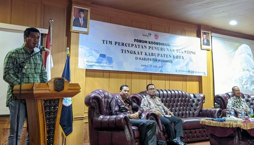 MERANGIN - Wabup Merangin, Nilwan Yahya membuka forum koordinasi Tim Percepatan Penurunan Stunting (TPPS) Kabupaten Merangin 2023, di Aula Depati Payung Bappeda Merangin, Kamis (15/6/23). Ketua TPPS Merangin tersebut mengatakan, stunting tidak hanya mengenai pertumbuhan anak yang terhambat, tapi juga berkaitan dengan perkembanganan otak yang kurang maksimal. ‘’Kondisi ini menyebabkan kemampuan mental dan belajar anak di bawah rata-rata. Ini bisa berakibat prestasi belajar yang buruk,’’ ujar Wabup dibenarkan Kadis PPKB Merangin H Abdaie. Kunci pencegahan stunting jelas wabup, ada pada seribu Hari Pertama Kehidupan (HPK), sehingga perhatian kepada ibu hamil serta balita perlu terus ditingkatkan. Selain itu pinta wabup, intervensi terhadap remaja putri dan calon pengantin juga terus dilakukan, sehingga tercipta generasi yang cerdas, sehat dan berprestasi terhindar dari stunting. ‘’Alhamdulillah berkat kerja keras kita semua, angka stunting di Kabupaten Merangin mengalami penurunan dari 19,7 persen menjadi 14,5 persen. Untuk Provinsi Jambi juga turun dari dari 22,4 persen menjadi 18 persen,’’ terang Wabup. Sedangkan untuk Indonesia, angka stunting juga berhasil diturunkan dari 24,4 persen menjadi 21,6 persen. Pada kesempatan itu, wabup mengapresiasi dan berterimakasih kepada seluruh pihak yang berkontribusi dalam TPPS Merangin. ‘’Semoga pada 2024 nanti, target prevalensi stunting Kabupaten Merangin menjadi sembilan persen dapat kita capai. Teruslah bekerja semaksimal mungkin, sehingga Merangin bisa bebas dari stunting,’’ pinta Wabup. Tampak hadir pada acara tersebut, Kabid Kesmas Dinas Kesehatan Provinsi Jambi H Muhammad Syafrizal dan para pengurus dan Satgas Stunting Provinsi Jambi serta para kepala Organisasi Daerah (OPD) di jajaran Pemkab Merangin. Terpisah, Sekretaris Perwakilan BKKBN Provinsi Jambi Yudi Hendra Musrizal mengatakan, melihat data keluaga beresiko stunting dan data anak stunting menjadikan TPPS, harus tetap memfokuskan pada usaha pencegahan dan memperbaiki anak dengan stunting, ‘’Apa yang sudah kita lakukan, terlihat pada jumlah anak stunting yang menurun. Kita pastikan para balita siap dalam kondisi normal pada pelaksanaan survei yang akan dilakukan pada Agustus - September 2023 mandatang,’’ pinta Yudi Hendra. Pencegahan kejadian stunting lanjut Yudi, dapat dilakukan melalui berbagai cara, salah satunya program elsimil (elektronik siap nikah siap hamil), dengan melakukan skrining calon pengantin dari status Kesehatan, apakah sudah siap untuk menikah dan hamil. Selain itu, pendampingan keluarga berisiko stunting oleh TPK (Tim Pendamping Keluarga) juga harus terus digejot. Jumlah pendamping keluarga untuk Kabupaten Merangin sejumlah 699 petugas. Yudi juga berharap, intervensi kepada anak stunting dan keluarga berisiko stunting juga dilakukan sektor lain, seperti dunia usaha baik perusahaan atau perorangan, dengan program Bapak Asuh Anak Stunting.