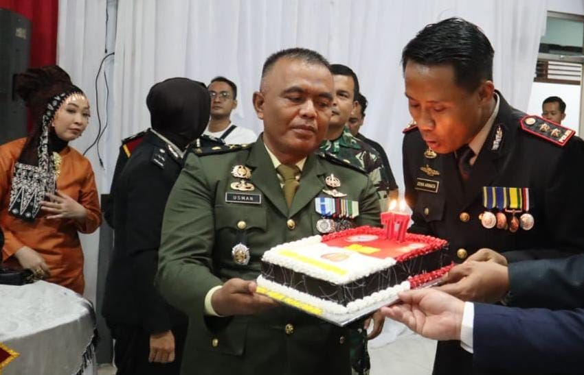 MERANGIN - Polri merayakan hari jadinya yang ke 77 tahun ini tepatnya hari Dabtu, 1 Juli 2023, berlangsung di seluruh jajaran Se-Indonesia. Pejabat Kodim 0420/Sarko memenuhi undangan serta menghadiri rangkaian peringatan HUT Polri Ke 77 di Polres Merangin dan Polres Sarolangun jajaran Polda Jambi. Tidak hanya pejabat Kodim 0420/Sarko, upacara tersebut juga di hadiri prajurit Kodim 0420/Sarko dalam pelaksanaan upacara tersebut. Kasdim 0420/Sarko Mayor Inf Usman S.Ag., M.Pdi dan pejabat lainnya menghadiri di Polres Merangin. Sedangkan di Polres Sarolangun di wakili oleh Danramil 04/Sarolangun Mayor Inf Abdul Azis Efendi beserta Danramil jajaran wilayah Kabupaten Sarolangun. Di jelaskan Mayor Inf Usman selain menghadiri acara tersebut kami juga memberikan ucapan selamat dan sukses kepada Polri di HUT Ke 77 tahun ini. Sinergi TNI-Polri yang sudah terjalin selama ini kami juga menghadiahi dengan nasi tumpeng dan kue kepada Kapolres Merangin dan Kapolres Sarolangun, hal ini juga sebagai penanda penguatan sinergitas. Dengan simbolis ini menandakan sinergi TNI-Polri khususnya di wilayah benar-benar terjalin dengan baik dan akan terus terpatri demi menjaga stabilitas kamtibmas. Pelaksanaan peringatan HUT Polri Ke 77 juga di hadiri masing-masing Forkopimda Merangin dan Sarolangun serta tamu undangan lainnya. Syukuran dan upacara HUT Polri Ke 77 berlangsung hikmat. "Atas nama keluarga besar Kodim 0420/Sarko kami mengucapkan selamat dan sukses HUT Polri Ke 77, Salam Presisi," pungkasnya.Penulis: Doni Sobri