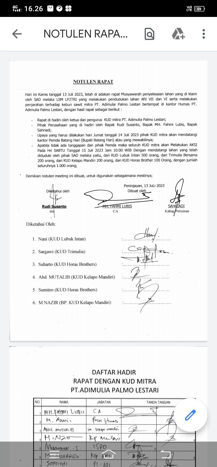 MH . Fahmi Lubis Humas PT. Adimulia Palmo Lestari mengatakan, aksi ini akan dilakukan Ketua dan Pengurus KUD Mitra PT. Adimulia Palmo Lestari itu berdasarkan hasil rapat musyawarah penyelesaian lahan yang diklaim oleh SAD melalui LSM LP2TRI yang berlokasi di Afd VII dan VI PT. Adimulia Palmo Lestari serta melakukan penjarahan terhadap kebun Mitra PT. APL di Kantor Humas PT. APL pada Kamis 13 Juli 2023 yang dihadiri Ketua dan Pengurus KUD Mitra PT. APL serta pihak perusahaan yang dihadiri oleh Rudi Susanto, MH. Fahmi Lubis dan Sahriadi.