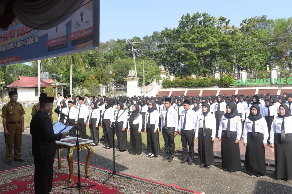 MERANGIN - Bupati Merangin, Mashuri menyerahkan surat keputusan pengangkatan Pegawai Pemerintah dengan Perjanjian Kerja (P3K) formasi 2022, secara simbolis di halaman depan kantor lama bupati Merangin, Senin (07/8/23).