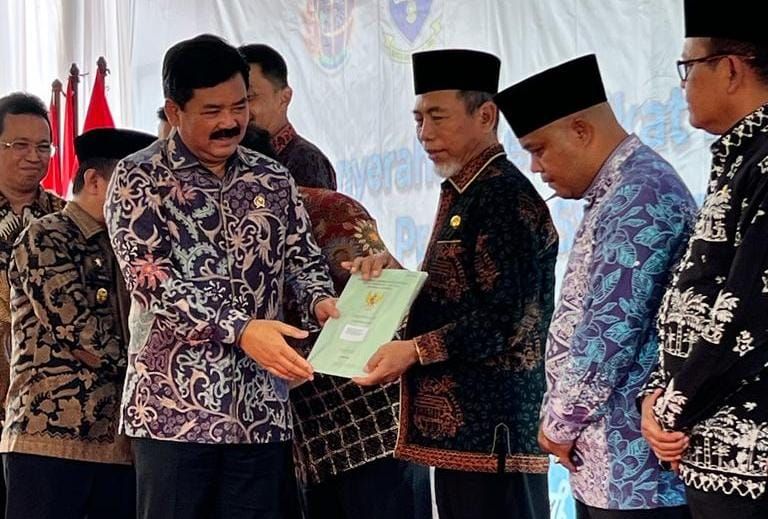 MERANGIN - Bupati Merangin, H. Mashuri menerima sertifikat hak pakai instansi, program strategis nasional, wakaf dan rumah ibadah dari Menteri ATR/BPN Hadi Tjahjanto pada acara Panen Raya Sertifikat PTSL di Candi Muaro Jambi, Kamis (24/8/23). Selain bupati kepala daerah lainnya di Provinsi Jambi juga menerima sertifikat tersebut. ‘’Alhamdulillah fasilitas yang diberikan tersebut, akan kita manfaatkan semaksimal mungkin,’’ ujar Bupati. Menteri ATR/BPN Hadi Tjahjanto mengatakan, estimasi jumlah bidang tanah di Provinsi Jambi sebesar 2,5 juta bidang, telah terdaftar sebanyak 1,8 juta bidang tanah atau sekitar 72 persen, sehingga masih tersisa ± 650.000 bidang yang belum terdaftar. ‘’Bidang tanah yang belum didaftarkan, agar segera dipetakan dan didaftarkan, sehingga pada tahun 2025 seluruh bidang tanah sudah terdaftar sesuai dengan target,’’ pinta Hadi Tjahjanto. Dengan demikian lanjut Menteri, capaian PTSL di Provinsi Jambi merupakan realisasi program yang cukup baik dan cepat. Hadi mengapresiasi kinerja BPN dan dukungan Forkompimda serta masyarakat terhadap program PTSL di Jambi. Pada kesempatan itu Hadi Tjahjanto juga menyerahkan sertipikat hak pakai Candi Muaro Jambi yang luasnya mencapai 97,2 hektare di Kawasan wilayah Kabupaten Muarajambi. Penyerahan sertifikat hak pakai Candi Muaro Jambi itu adalah bentuk komitmen dari Kementerian ATR/BPN untuk menyelamatkan situs-situs cagar budaya di Indonesia dan akan menjadi destinasi pariwisata andalan di Provinsi Jambi.Penulis: Doni Sobri