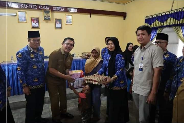 SUNGAI PENUH - Walikota Sungai Penuh, Drs. Ahmadi Zubir, MM Menyerahkan secara simbolis bantuan stunting kepada masyarakat Kecamatan Sungai Penuh yang terkena stunting, bertempat di aula Kantor Camat Sungai Penuh, Senin (18/9).