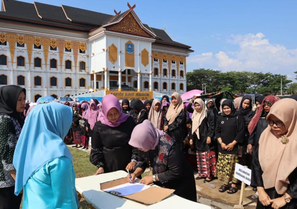 MERANGIN - Peran perempuan sangatlah strategis di dalam pembangunan dan tentunya perempuan Melayu memiliki kesempatan dan peluang yang sama untuk bekiprah di semua aspek pembangunan. Hal tersebut sebagaimana dikatakan Wabup Merangin Nilwan Yahya, pada acara pelantikan pengurus Himpunan Perempuan Melayu Jambi (HPMJ) kecamatan se-Kabupaten Merangin di halaman kantor baru bupati Merangin, Rabu (20/9/23). ‘’Saat perempuan Melayu ada sudah banyak menduduki jabatan di bebagai bidang. Tentunya hal ini perlu kita dorong, sehingga partisipasi perempuan semakin meningkat,’’ ujar Wabup. Diharapkan wabup, HPMJ bisa bersinergi dengan Pemerintah Daerah dan bersama-sama membangun Bumi Tali Undang Tambang Teliti Kabupaten Merangin. Berbagai terobosan dan inovasi dari setiap HPMJ kecamaan sangat diharapkan. Pada kesempatan itu wabup minta HPMJ menyatukan visi dan misi, demi menjaga persatuan dan kesatuan bangsa, sehingga perbedaan budaya yang ada menjadi khasanah bagi keharmonisan kehidupan bermasyarakat berbangsa dan bernegara. Pelantikan sebanyak 800 orang pengurus HPMJ kecamatan se-Kabupaten Merangin itu, dilaksanakan sebagai tindak lanjut dari pembentukan pengurus HPMJ Kabupaten Merangin beberapa waktu lalu. ‘’Semoga dilantiknya pengurus HPMJ kecamatan se-Kabupaten Merangin ini, bisa menjadi salah satu wadah bagi perempuan Melayu Jambi untuk menyalurkan ide-ide dan kreatifitasnya, terutama untuk kelestarian budaya Melayu Jambi,’’ harap Wabup. Pelantikan pengurus HPMJ kecamatan se-Kabupaten Merangin yang belangsung khidmat tersebut, dilakukan oleh Ketua HPMJ Kabupaten Merangin Siti Aminah. Tampak hadir Wakil Ketua TP PKK Merangin Ny Juniarti Nilwan, kepala OPD, para camat, Ketua MUI Merangin H Dr Joni Musa dan Ketua Dewan Masjid H Arfandi.