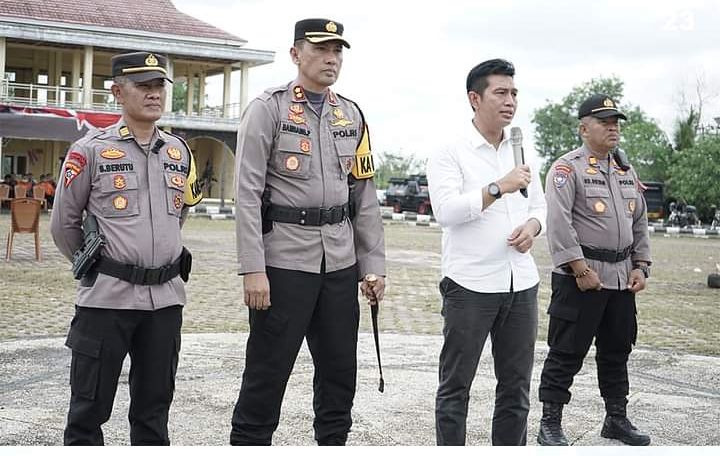 MUARABULIAN - Bupati Batanghari, Muhammad Fadhil Arief, SE menghadiri latihan Sispamkota Polres Batanghari dalam rangka pengamanan pemilu 2024 bertempat di Exs Arena MTQ Kabupaten Batanghari, Rabu (25/10/23)