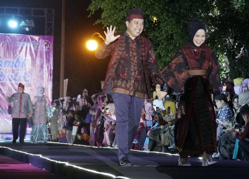 Bangko- Dalam Rangka Hari Batik Nasional Tahun 2023, Pemerintah Provinsi Jambi melaksanakn Pagelaran Parade 'Jambi Berbatik' dan Fashion Show. Pagelaran Jambi Berbatik itu, dilaksanakan ditaman peranginan depan Rumah dinas Gubernur Jambi, Rabu malam (25/10/23) Pukul 20.00 WIB. Dibuka secara resmi oleh Gubernur Jambi DR. H Al Haris bersama Ketua Dekranasda Provinsi Jambi Hj Hesnidar Haris. Diikuti Kepala Daerah se Provinsi Jambi dan 700 peserta dari berbagai Dinas Instansi BUMN Provinsi Jambi, serta Perwakilan Anak Sekolah dalam kota Jambi. Sejatinya Jambi Berbatik tersebut merupakan puncak dari Hari Batik Nasional tanggal 2 Oktober 2023 lalu, namun Pemkab Provinsi hendak melakukan lebih Gebyar seiring dengan Hari jadi Dekranasda Provinsi Jambi, sehingga dilakukan pada malam ini, dengan tema ' Melestarikan Budaya Menjaga Warisan Bangsa'. Saat penampilan Penjabat Bupati Merangin H Mukti Said beserta Istreri DR Hj Indrina Mayesti Mukti yang memakai batik bermotif Kepayang Mabuk asal Muara Jernih, tampak memukau sambil senyum sumringah kepada para penonton dan hadirin yang ada malam itu. Pj Bupati Merangin H Mukti Said usai memperagakan Pakaian Batiknya, mengatakan tujuan pagelaran Jambi Berbatik itu sebagai promosi hasil kerajinan batik serta membangkitkan semangat tiap Kabupaten dalam peluang pemasaran. "Karena Batik Jambi sudah dikenal Nusantara bahkan Internasional, tidak tertutup kemungkinan bagi para pengrajin Kabupaten berpeluang untuk mendapatkan pemasaran secara luas," ujar Pj Bupati. Lebih lanjut H Mukti mejelaskan peragaan Jambi Berbatik itu bermaksud agar masyarakat jambi lebih mencintai Batik karya kearifan lokal. "Masyarakat Jambi umumnya diharapkan untuk lebih mencintai karya karya negeri sendiri terutama Batik," tutupnya.