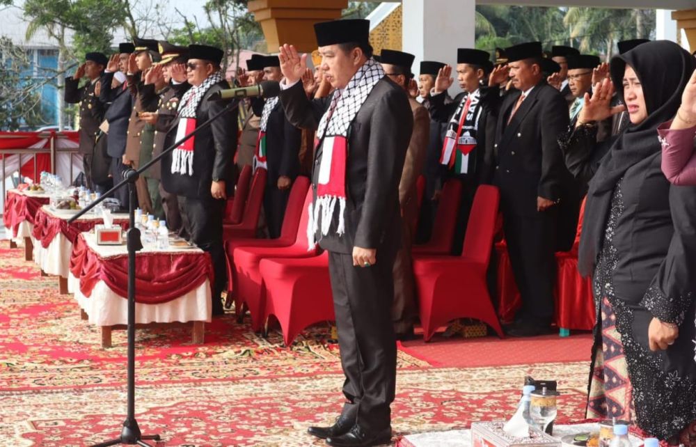 Merangin - Kabupaten Merangin memperingati hari Pahlawan ke-78 yang dipusatkan pada upacara pengibaran bendera, di halaman depan kantor baru bupati Merangin, Jumat (10/11/23). Upacara yang berlangsung khidmat itu, diikuti barisan dari Kodim 0420 Sarko, Poles Merangin, Brimob Batalyon B Pelopor Pamenang, Satpol PP, Perhubungan, BPBD, Korpri, Mahasiswa, Pelajar, Pramuka dan barisan lainnya. Tampil sebagai Inspektur Upacara Pj Bupati Merangin H Mukti. Pada pengarahannya Pj bupati membacakan sambutan Menteri Sosial Republik Indonesia Tri Rismaharini. Dikatakan H Mukti, hari Pahlawan ke-78 kali ini, diperingati dengan mengusung tema ‘Semangat Pahlawan untuk Masa Depan Bangsa dalam Memerangi Kemiskinan dan Kebodohan’. ‘’Tema ini diangkat melalui renungan yang mendalam untuk menjawab ancaman penjajahan modern yang kian nyata. Mengingat kita merupakan pasar yang besar dan dikaruniai begitu banyak sumber daya alam yang luar biasa,’’ ujar Pj Bupati. Itulah lanjut H Mukti, tantangan yang sesungguhnya bagi generasi penerus untuk mengelola kekayaan alam dan juga potensi penduduk Indonesia bagi kejayaan Bangsa dan Negara. ‘’Ancaman dan tantangan ini akan kita taklukkan berbekal semangat yang sama seperti dicontohkan para pejuang 10 November 1945. Tidak mudah memang, tapi pasti bisa,’’ tegas H Mukti. Pahlawan jelas Pj bupati, orang yang menonjol karena keberanian dan pengorbanannya dalam membela kebenaran serta mengutamakan kepentingan Bangsa dan Negara di atas kepentingan kelompok dan atau diri sendiri. Pada akhir acara, bupati menyantuni dua orang peteran Kabupaten Merangin yang khusuk mengikuti jalannya upacara peringatah hari Pahlawan ke-78, pada 10 November 2023. Usai upacara peringatan hari Pahlawan di Kabupaten Merangin, Pj Bupati Merangin H Mukti bersama rombongan bertolak ke Makam Pahlawan Patriot Bhakti, untuk mengikuti upacara Ziarah Tabur Bunga.